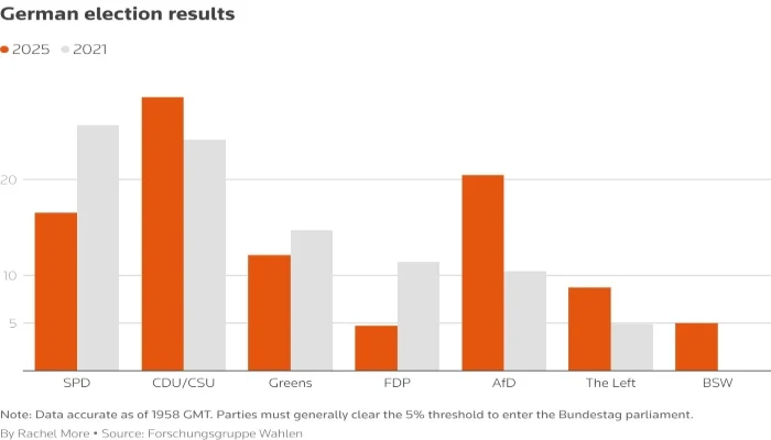 Friedrich Merz’s conservatives have won Germany’s election, well ahead of rival parties but short of the 30% vote share they had expected.