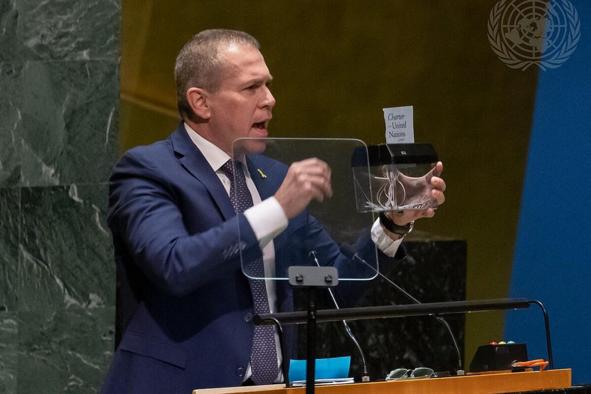 Israeli Ambassador to the United Nations Gilad Erdan shredded a copy of the UN Charter with a mini shredder as the general assembly supported a Palestinian bid to become a UN member.