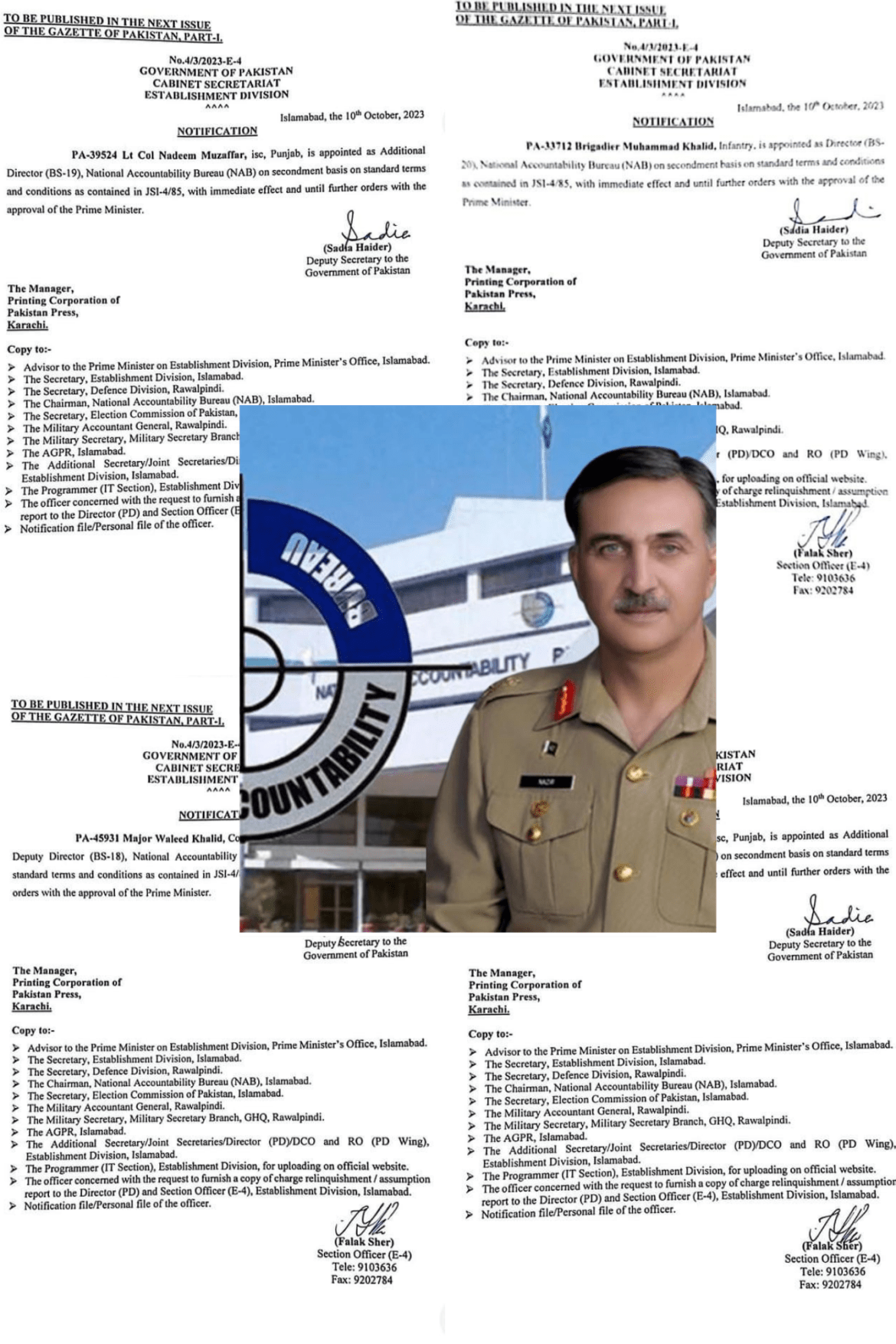 According to the notification, Brigadier Muhammad Khalid of infantry has been appointed Director National Accountability Bureau in (BS-20), Lt Col Nadeem Muzaffar as Additional Director in (BS-19), Major Waleed Khalid of Military Intelligence as Deputy Director (BS-18), and Major Qais Kamran Syed of Military Intelligence as Deputy Director (BS-18).