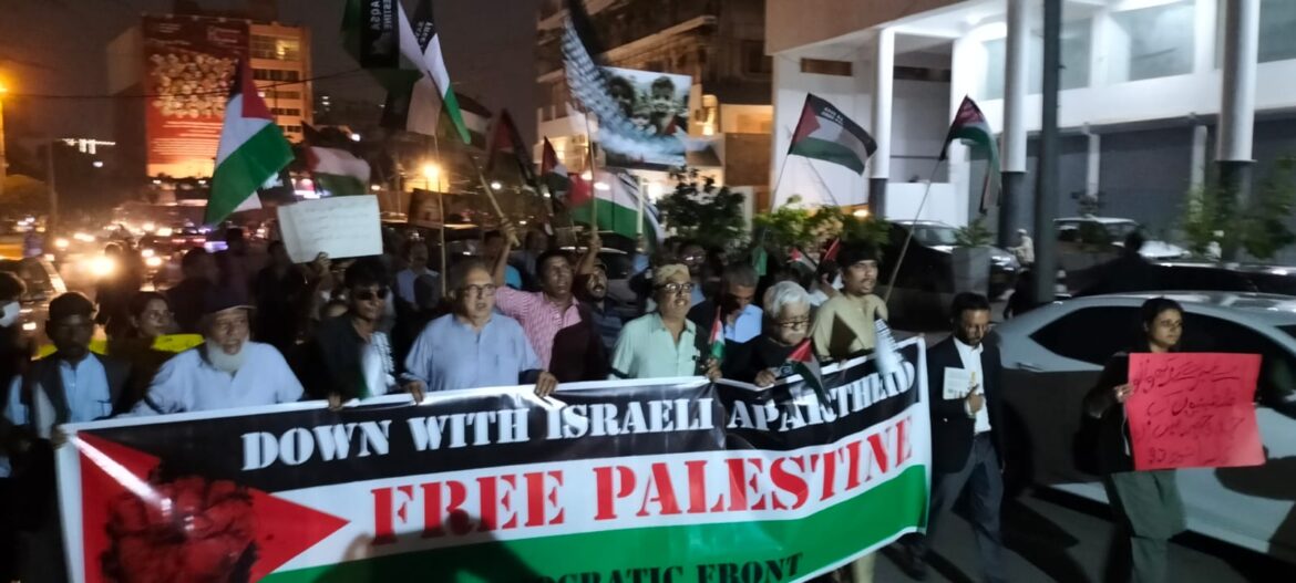 The Left Democratic Front Karachi and civil society activists on saturday to protest against the ongoing military offensive in Gaza.