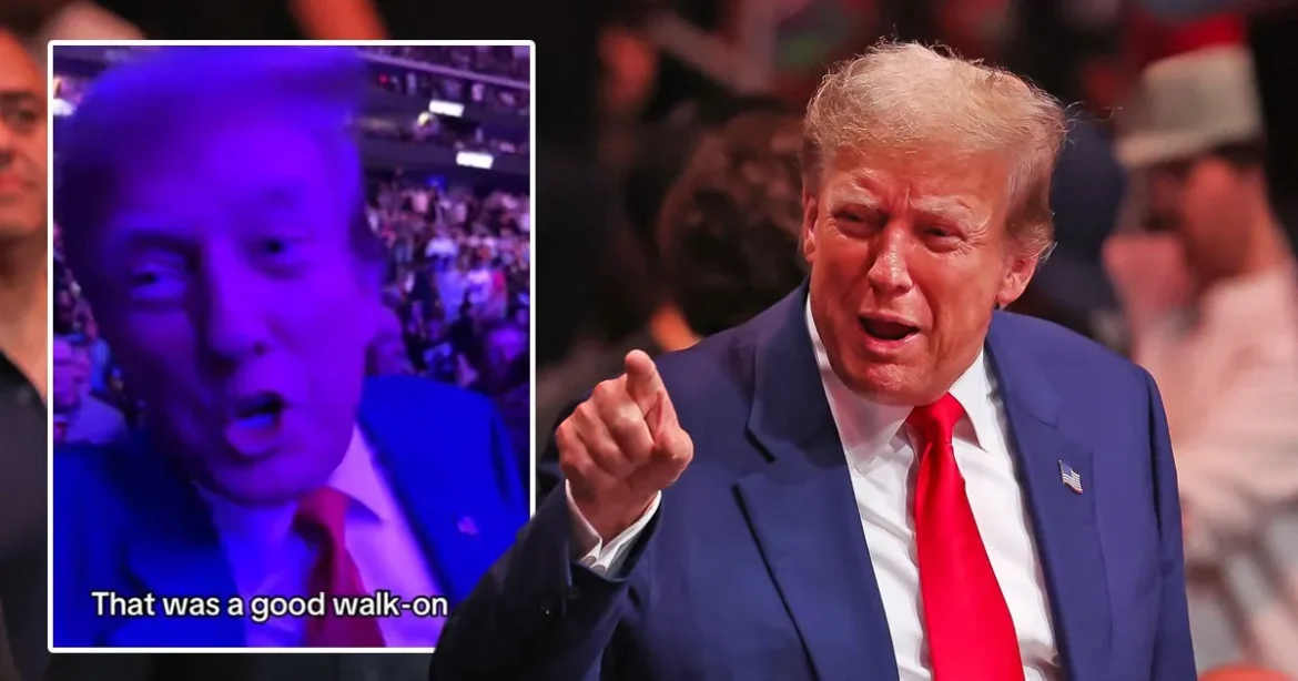 In the video, which features raucous music, Trump is introduced by UFC CEO Dana White and leans into the camera saying, “It’s my honor.” Trump greets people at the UFC arena and concludes the clip by saying, “That was a good walk-on, right?”